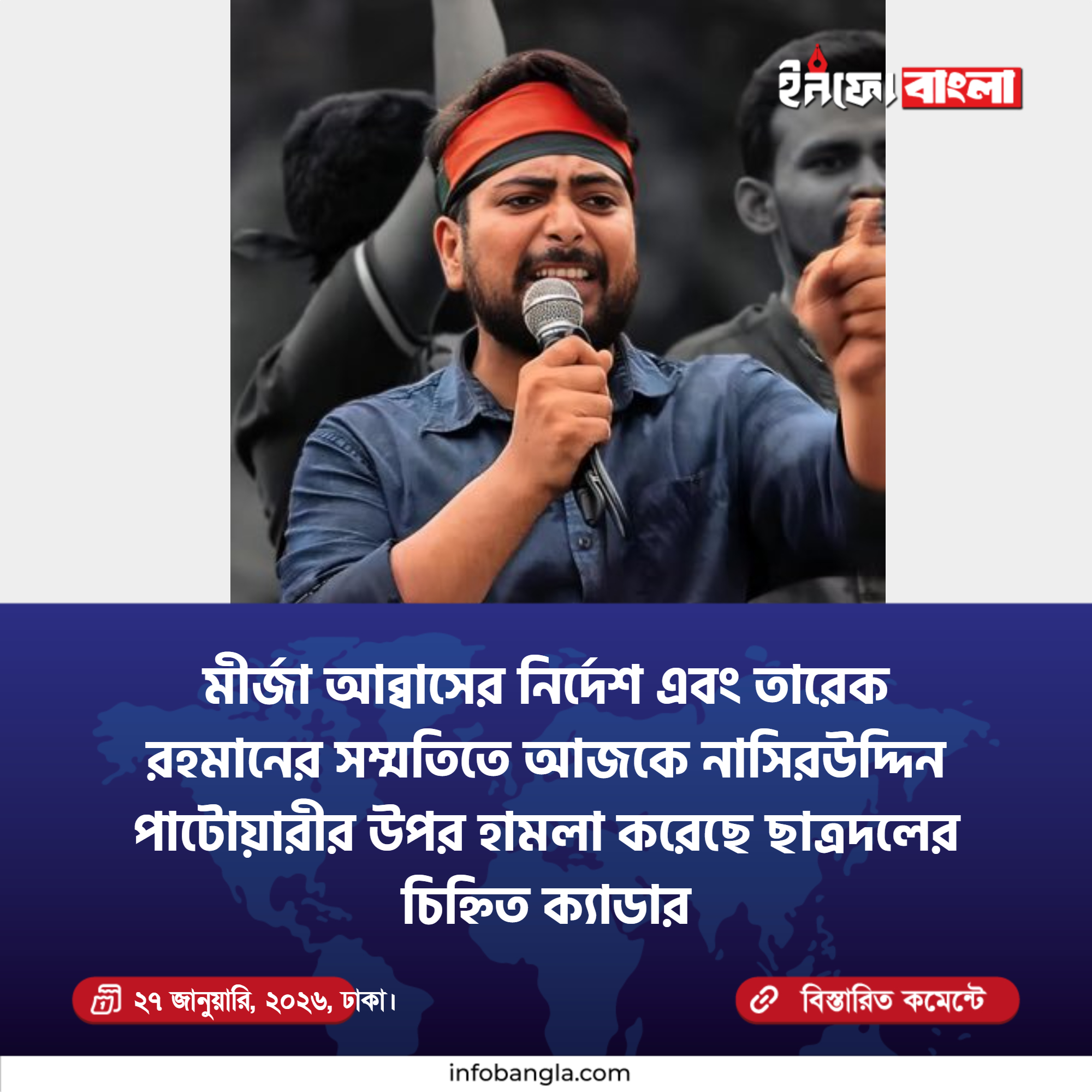 আজ ২৭ জানুয়ারি, ২০২৬ সকালে ঢাকা শান্তিনগরে হাবিবুল্লাহ কলেজে হামলার শিকার হন এনসিপির প্রার্থী নাসিরুদ্দিন পাটোয়ারী। এই ঘটনার নিন্দা ও প্রতিবাদ জানিয়ে জাতীয় নাগরিক পার্টি (এনসিপি)’র পক্ষ থেকে তাৎক্ষণিক সংবাদ সম্মেলন করে জাতীয় নাগরিক পার্টির আহবায়ক নাহিদ ইসলাম বলেন, “৫ আগস্ট পরবর্তী বাংলাদেশে বিএনপির ভেবেচিন্তে কাজ করা উচিত। তারা পরিকল্পিত ভাবে আজকে নাসিরুদ্দিন পাটোয়ারীর উপর তাদের পালিত সন্ত্রাসী বাহিনী দিয়ে হামলা করেছে। মীর্জা আব্বাসের নির্দেশ এবং তারেক রহমানের সম্মতিতে আজকে নাসিরউদ্দিন পাটোয়ারীর উপর হামলা করেছে ছাত্রদলের চিহ্নিত ক্যাডাররা।” ঢাকা-৮ আসনের ১১ দলীয় জোটের প্রার্থী ও জাতীয় নাগরিক পার্টির (এনসিপি) মুখ্য সমন্বয়ক নাসীরুদ্দীন পাটওয়ারীর ওপর ডিম নিক্ষেপ ও হামলা করে স্থানীয় জনতা। মঙ্গলবার (২৭ জানুয়ারি) সকালে রাজধানীর হাবিবুল্লাহ বাহার কলেজে নাসিরুদ্দিন পাটোয়ারী একটি পূর্বনির্ধারিত কর্মসূচিতে অংশ নিতে কলেজে পৌঁছালে নাসিরুদ্দীন পাটোয়ারীর দিকে ডিম নিক্ষেপ করা হয়। এ সময় তাকে মারধরের চেষ্টাও করা হয় বলে অভিযোগ রয়েছে। ঘটনার ফলে ক্যাম্পাসে কিছু সময়ের জন্য উত্তেজনাকর পরিস্থিতি সৃষ্টি হয়। এক পর্যায়ে পুলিশের উপস্থিতিতেও তার উপর ডিম নিক্ষেপ করতে দেখা যায়। পরে উপস্থিত পুলিশ ও স্থানীয়দের সহায়তায় পরিস্থিতি নিয়ন্ত্রণে আসে। হামলার ঘটনায় নাসিরুদ্দীন পাটোয়ারীসহ বেশ কয়েকজন আহত হন।