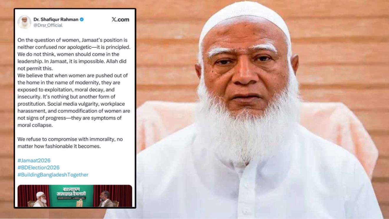 বাংলাদেশ জামায়াতে ইসলামীর আমির ডা. শফিকুর রহমান একটি X (টুইটার) পোস্টে নারীদের বিষয়ে দলের অবস্থান স্পষ্ট করে বলেছেন যে, আধুনিকতার নামে নারীদের ঘর থেকে বের করে দেওয়া হলে তারা শোষণ, নৈতিক অধঃপতন এবং নিরাপত্তাহীনতার শিকার হন। তিনি এটিকে সরাসরি “আরেক ধরনের বেশ্যাবৃত্তি” (another form of prostitution) বলে উল্লেখ করেছেন।