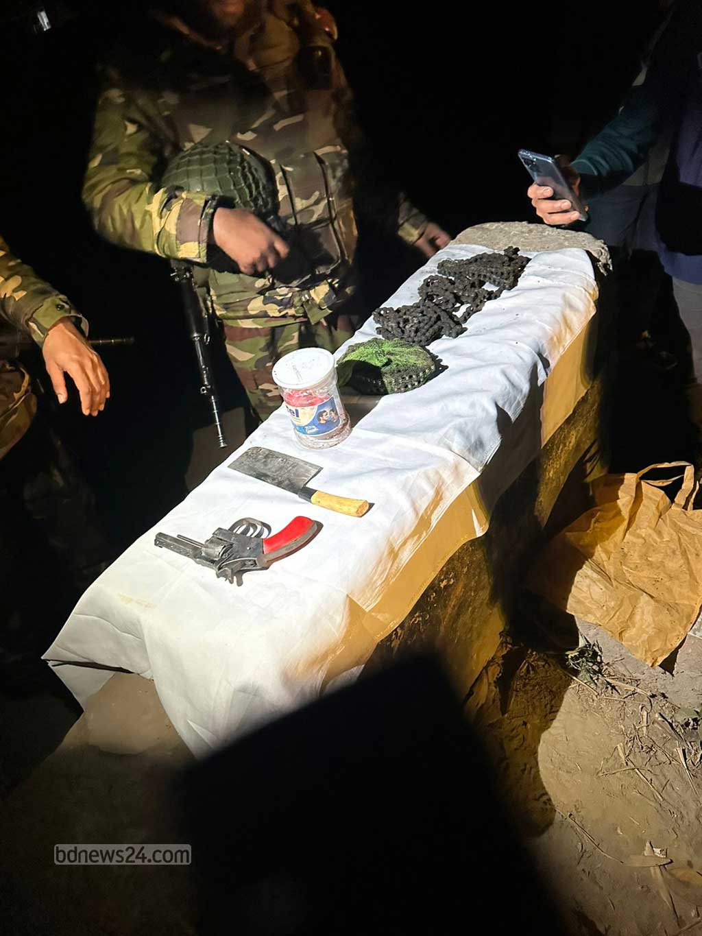 তিনি বলেন, সোমবার রাত ১২টার দিকে গোপন খবর পেয়ে উপজেলার লেছরাগঞ্জ বাজার সংলগ্ন সেতুর নিচে অভিযান চালায় যৌথবাহিনী। অভিযানে একটি রিভলভার, পাঁচটি হাতবোমা, দেশি ধারালো অস্ত্র এবং বৈদ্যুতিক সংযোগযুক্ত একটি বোমা উদ্ধার করা হয়।