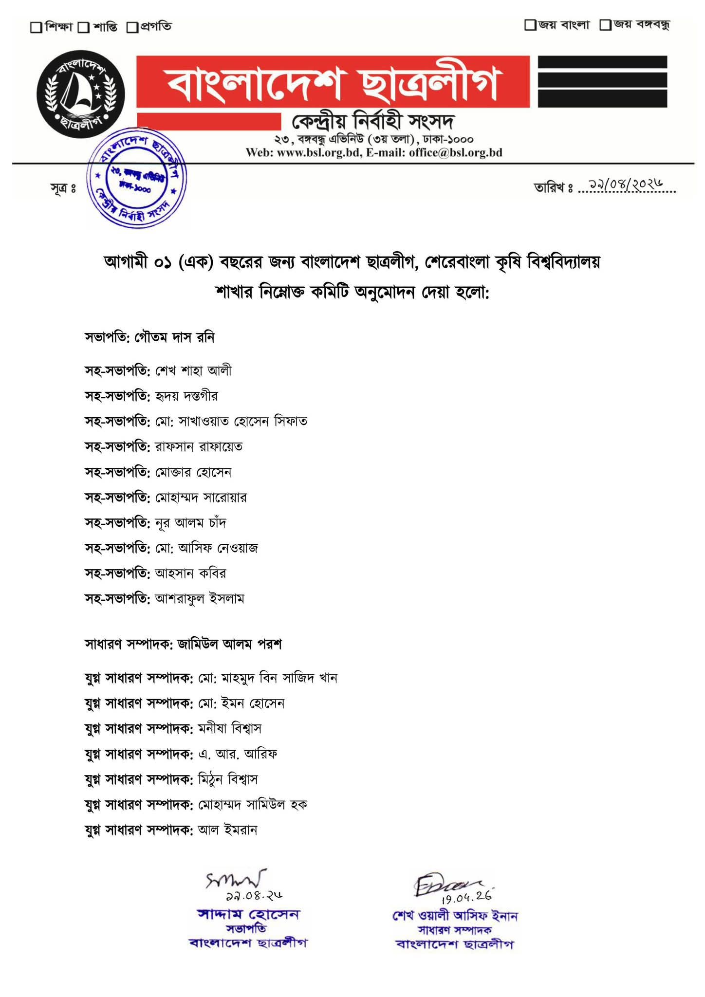শেরেবাংলা কৃষি বিশ্ববিদ্যালয় (শেকৃবি) শাখা ছাত্রলীগের নতুন কমিটি ঘোষণা করা হয়েছে। আগামী ১ (এক) বছরের জন্য এই কমিটির অনুমোদন দিয়েছে বাংলাদেশ ছাত্রলীগের কেন্দ্রীয় নির্বাহী সংসদ।